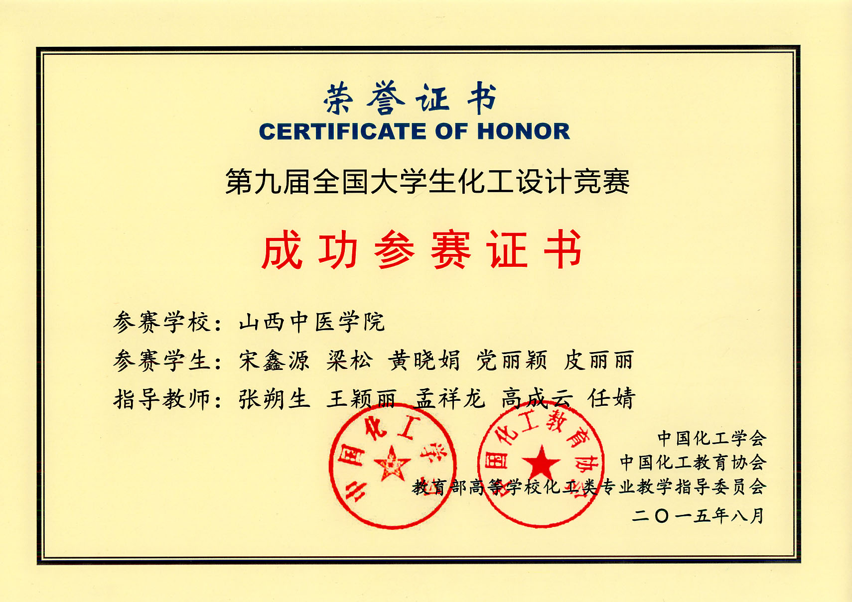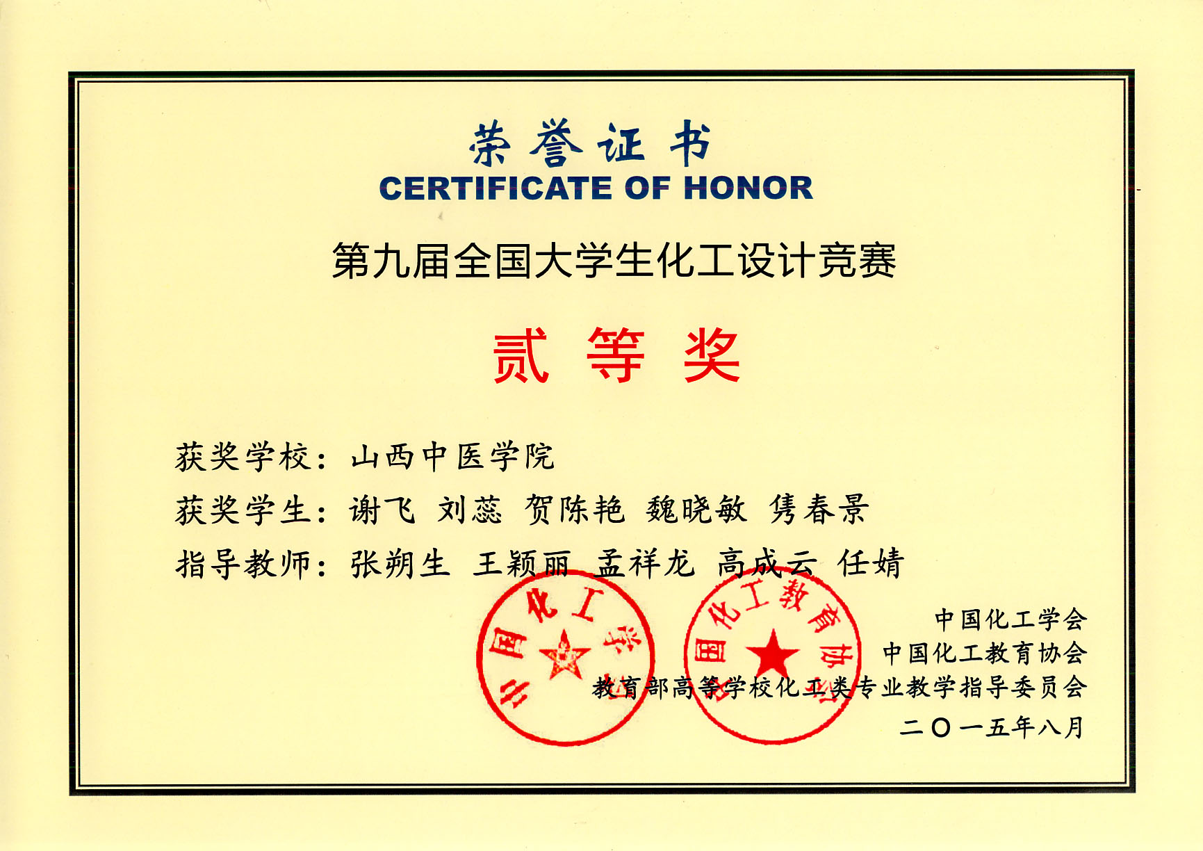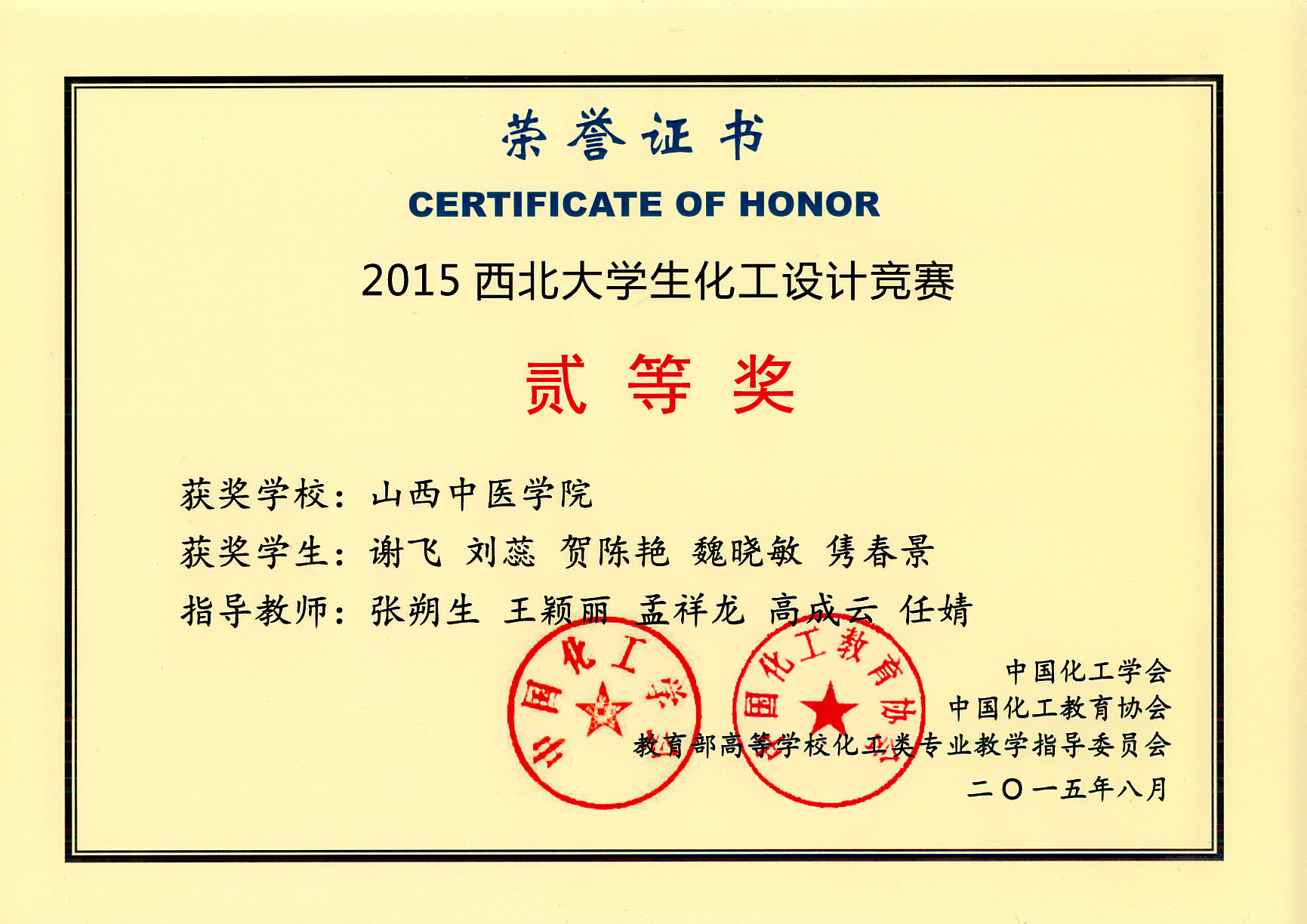 2015年8月3日至8月7日,我学院选派2012级制药工程专业谢飞等5名同学、孟祥龙老师为带队老师、高成云老师为答辩评审、任婧老师为专项评审等一行8人赴银川参加第九届全国大学生化工设计竞赛西北区决赛,经全团队老师和同学的辛勤努力,“杏林百草”设计团队喜获第九届全国大学生化工设计竞赛全国总决赛二等奖、西北赛区二等奖,“超越”设计团队喜获成功参赛奖。