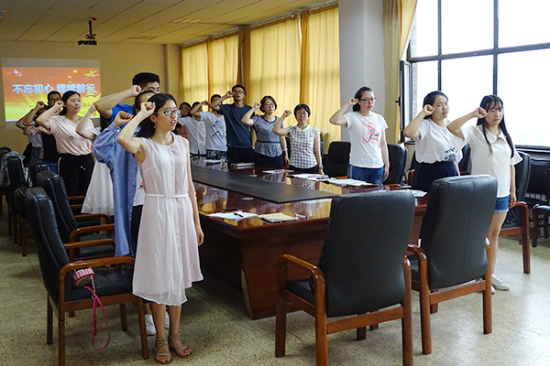 随后,全体毕业生党员面向党旗,重温入党誓词。