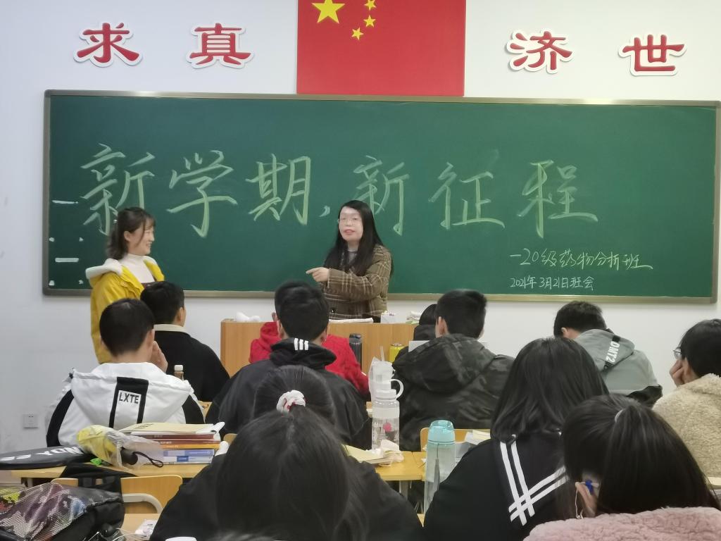 开始时,辅导员刘海鑫老师简单总结了上学期我班学习和生活情况,对上学期成绩不理想的同学提出了新的期许,也对表现优异的同学提出表扬,希望他们再接再厉,能够取得好成绩。随后来自大四的两位学姐和我们分享了考研的宝贵经验,前人走过的路上不长草,后人走过的路上会有前人的脚印。成功考上研究生后,学姐对自己上一年的努力进行了真情实感的总结,在为我们讲解时学姐重点强调了学习环境,互相鼓励,加油打气的重要性,也为同学们解答了我们对大学生活疑惑点,最后两位18级药物分析班的直系学姐,也为我们做了精彩的演讲,重点就学习方法,努力方向进行了讲解,更加充分直观的展现了大学生学习和生活该有的精神风貌。