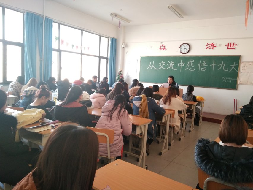 活动开始,团支书韩琦向大家介绍了本次活动意义旨在激励广大青年学生坚定理想信念,志存高远,脚踏实地,在推动我校共青团改革和各项事业发展中展示风采、建功立业。紧接着,孟喆老师教导大家只有我们学习好、贯彻好党的十九大精神,才能更好地履行党赋予的职责和使命,才能更好地保持自身的先进性,才能更好地了解把握国家和民族的发展大势,找准自身成长发展的正确路径。最后,孟喆老师希望大家以团小组讨论的形式展开交流并鼓励大家上台阐述一下交流的结果,大家都纷纷展开了激烈的讨论,并对党的十九大的精神有了更为深刻的理解。