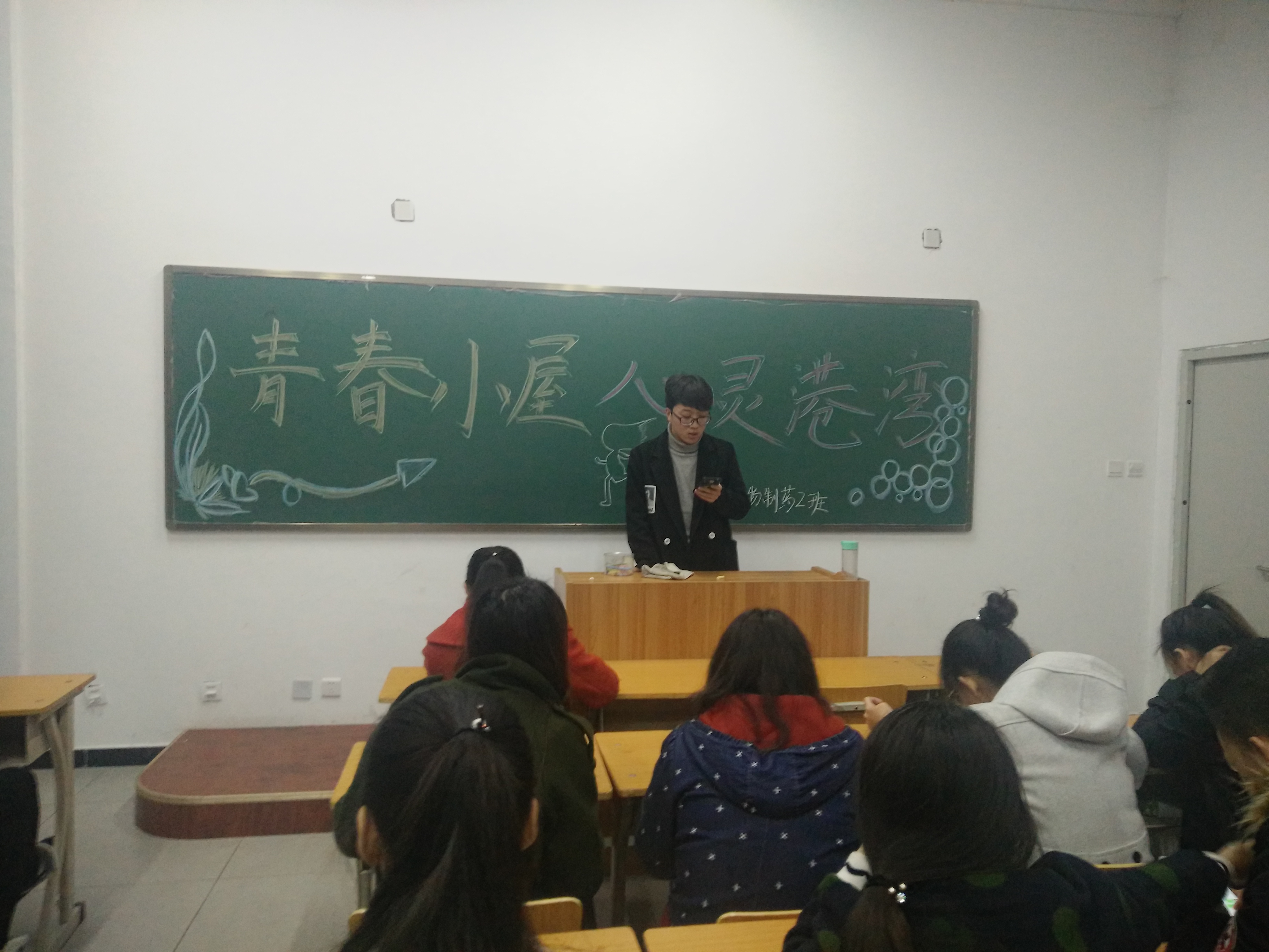 为传播心理健康知识,根据大学生的身心发展特点和教育规律,培养大学生良好的心理品质和自尊、自爱、自律、自强的优良品格。本班于2017年4月17日仁爱书院108室开展以“青春小屋,心灵港湾”为主题的心理活动。本次活动由心理委员张予涵主持,本班全体成员参加。