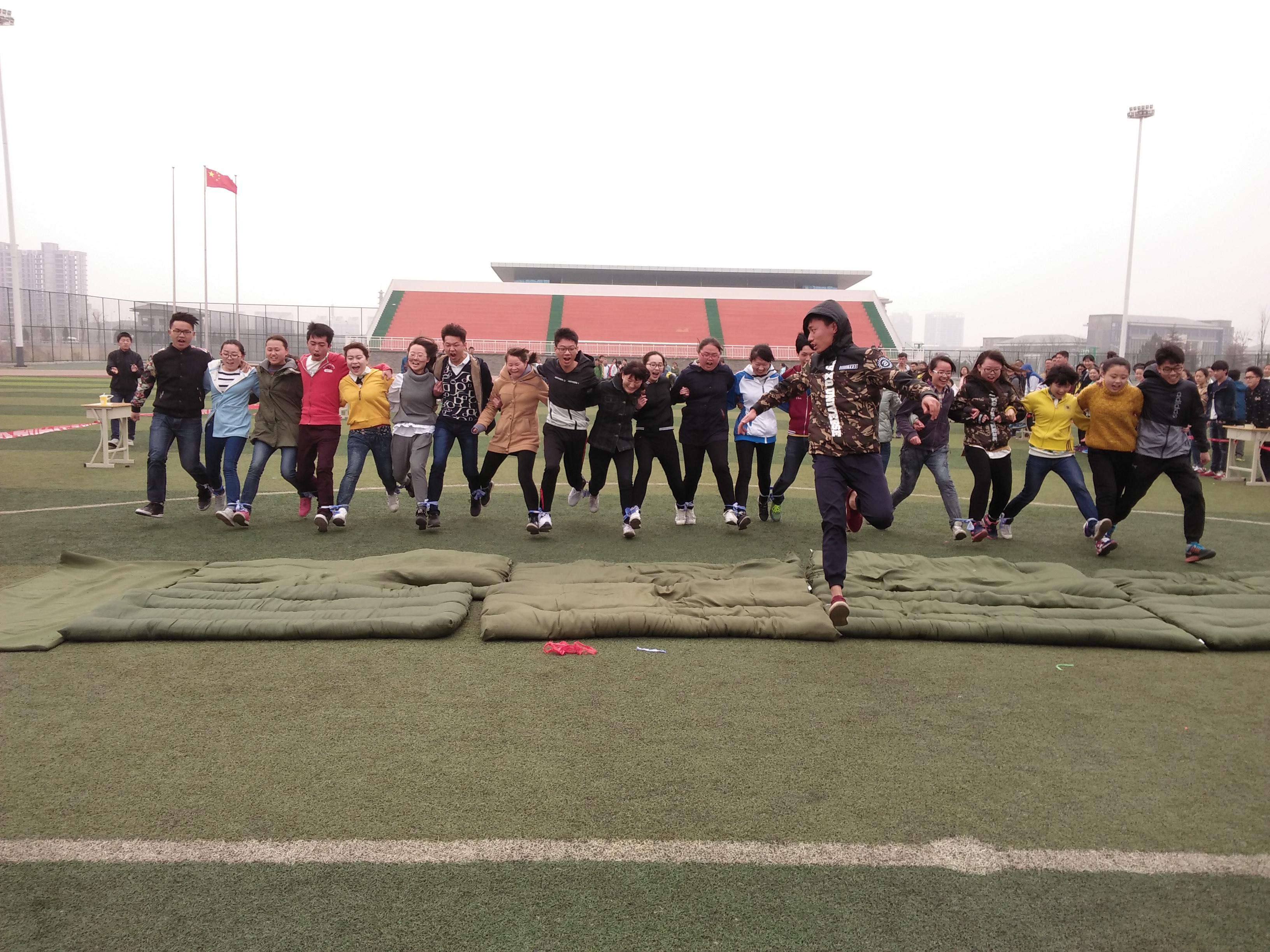 本次比赛是15年冬季拔河比赛的后续部分,今日进行齐心协力跳大绳和二十人多足项目。活动开始,主持人宣读比赛规则,希望大家以安全友谊第一,比赛成绩第二的心态参加比赛。本次运动会形式设计独具匠心,将竞技与娱乐相结合,不仅使团队精神得以体现,还兼顾了趣味性和互动性。比赛现场,掌声、笑声、观众们的“加油”声此起彼伏,场上场下互动交流,相互调侃,整个比赛过程充满欢乐的气氛。运动员们激情奔放,在激烈的角逐之后,体育部部长刘浩浩宣布本次运动会14级制药工程一班和15级制药工程4班分别获跳大绳、二十人多足项目冠军。