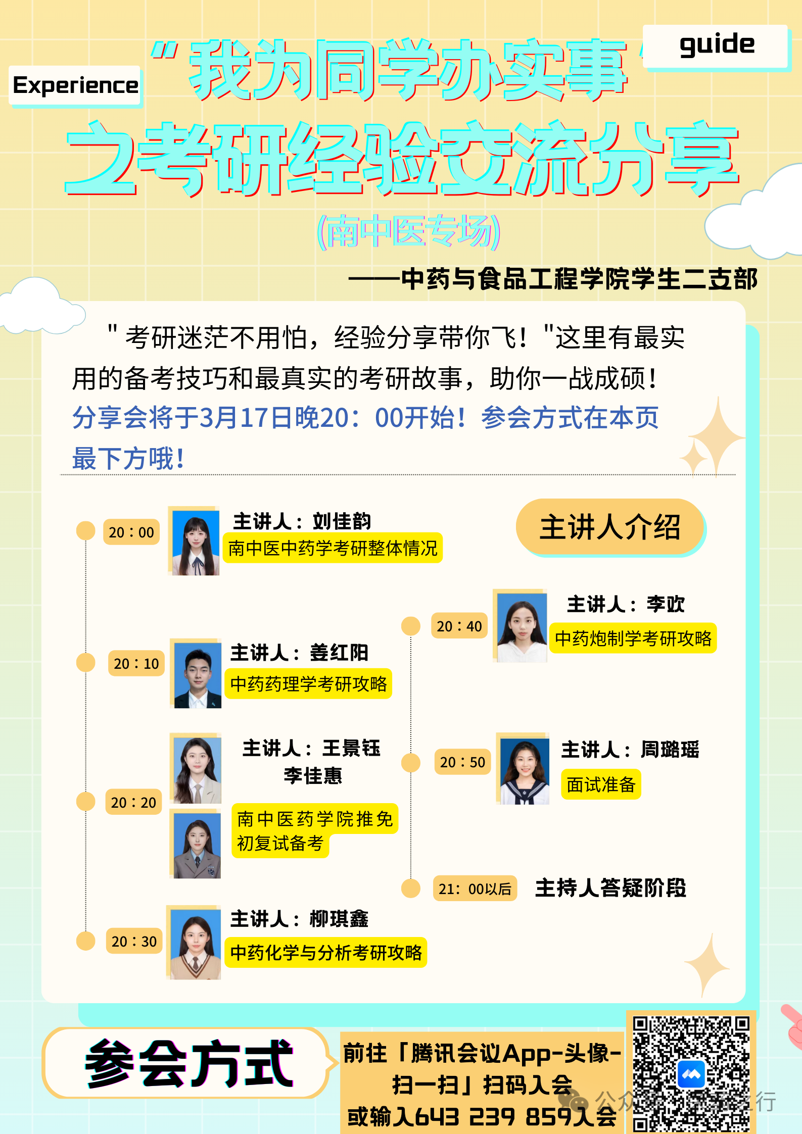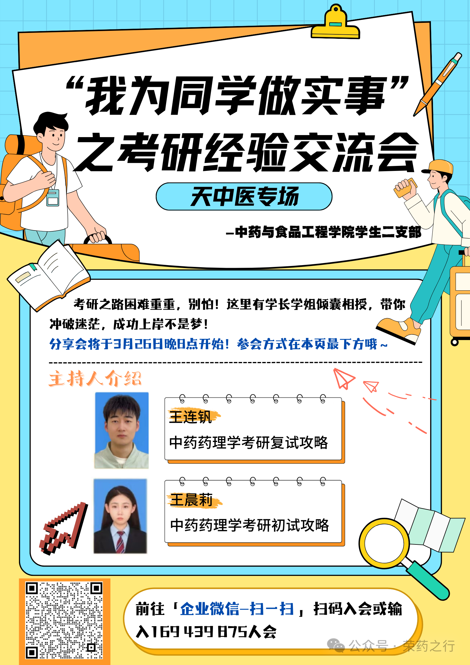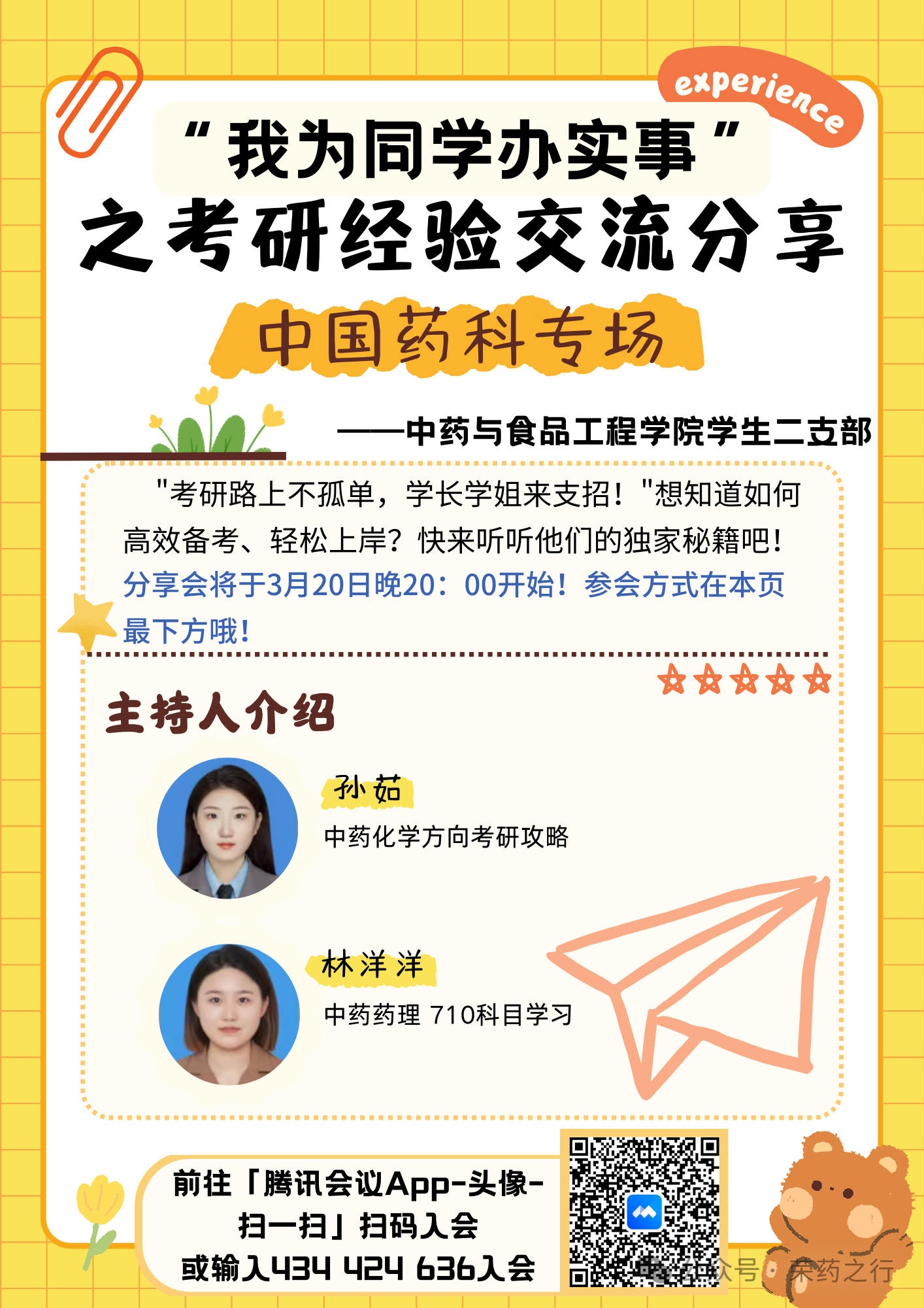 针对同学们普遍关注的考研方向选择、备考规划及复试技巧等问题,学生党支部联合学院优秀研究生代表及成功上岸学子,分别于3月17日召开了南京中医药大学专场、3月20日中国药科大学专场、3月26日天津中医药大学三场专题分享会,精准对接不同院校报考需求,每场活动均设置互动问答环节,主讲人针对学生个性化问题逐一解答,并建立线上交流群持续提供备考支持