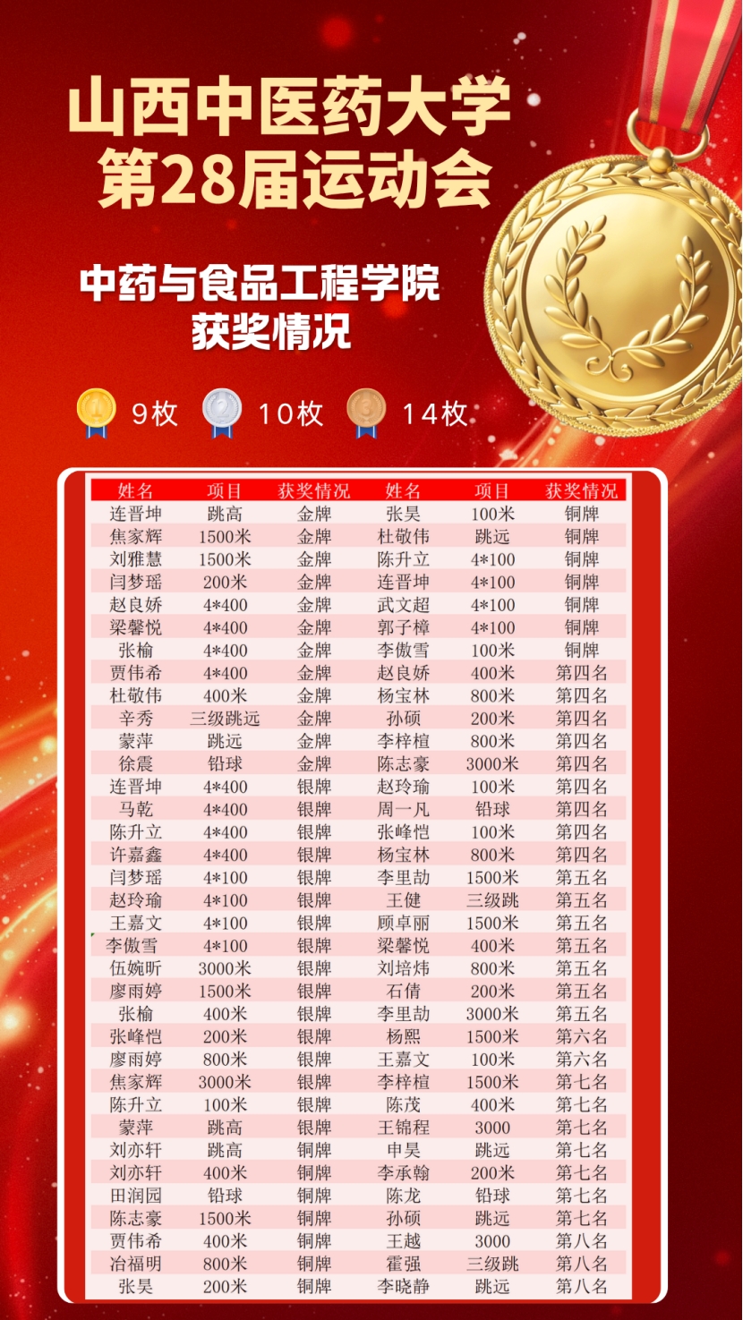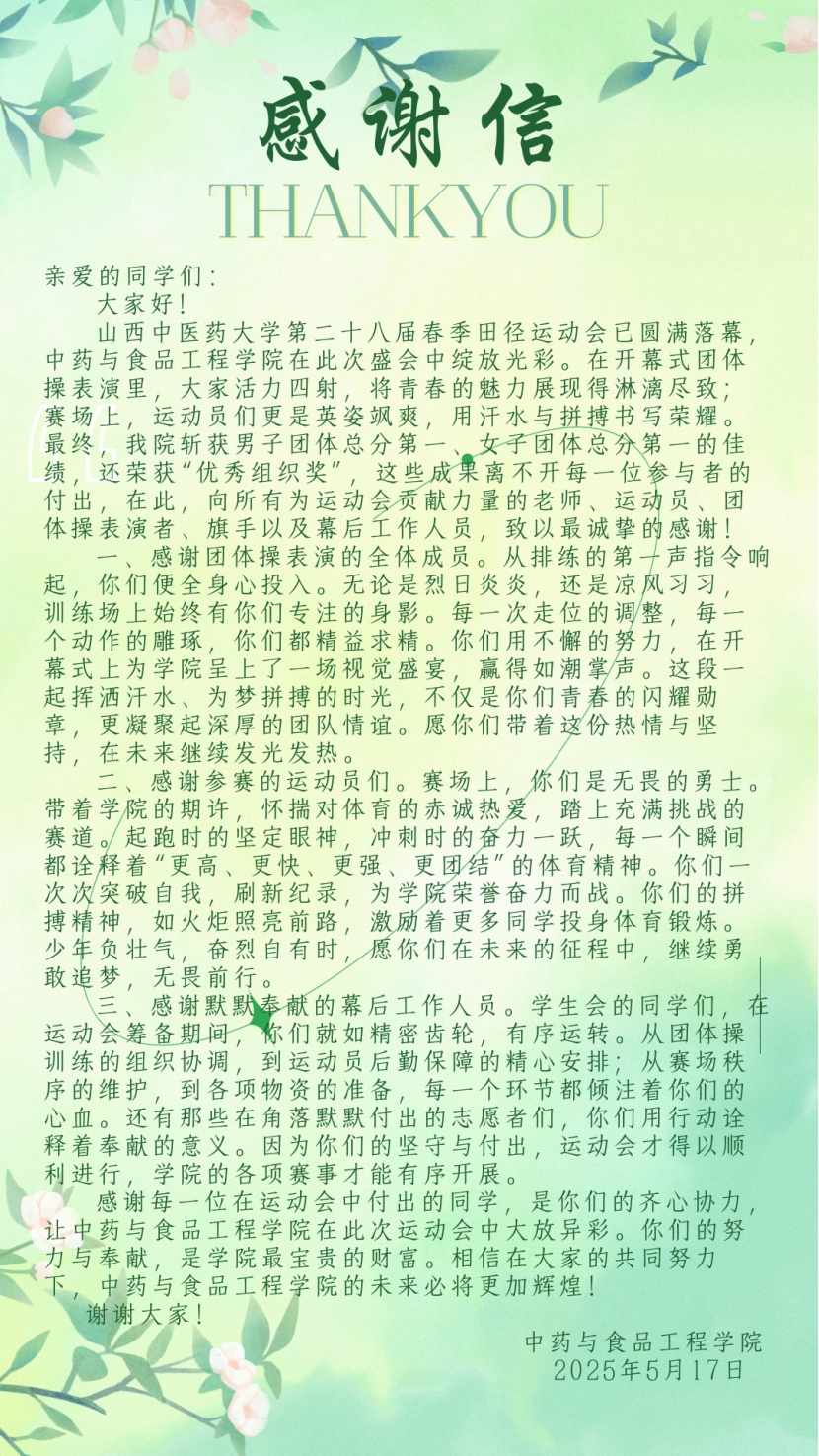 山西中医药大学第二十八届春季田径运动会于2025年5月17日圆满落幕。国产又粗又猛又大爽的健儿们在开幕式上以精彩的团体操表演赢得观众阵阵掌声,在赛场上更是奋勇拼搏,为学院赢得了男子团体总分第一,女子团体总分第一的傲人成绩,同时荣获“优秀组织奖”。