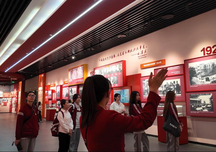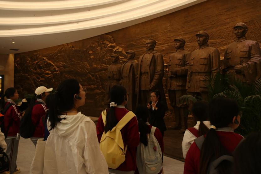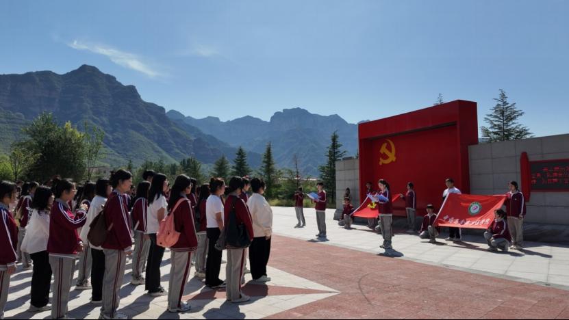 队伍首站抵达左权麻田八路军总部纪念馆,在革命旧址前举行纪念仪式:活动伊始,8 名同学分别携党旗、院旗入场,全体人员肃立行注目礼,以庄重姿态开启这场红色寻访;随后,由学生代表田怡珍、韩永超以 “迎国庆・忆初心 —— 在左权麻田传承抗战精神” 为题发言,回溯左权将军事迹与老区军民鱼水情;最后,学院党委副书记胡松洁带领全体师生党员重温入党誓词,誓言铿锵映初心。