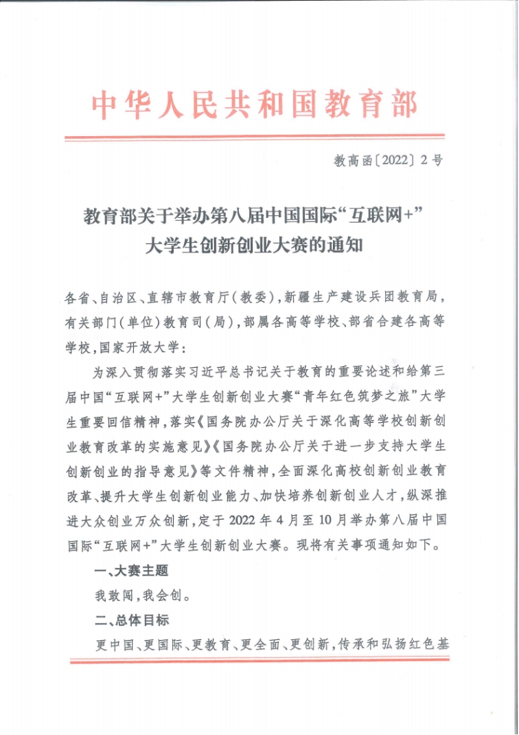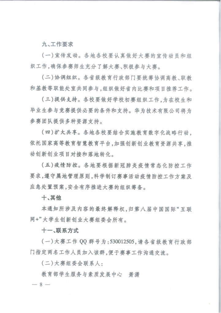 教育部关于举办第八届中国国际“互联网+”大学生创新创业大赛的通知