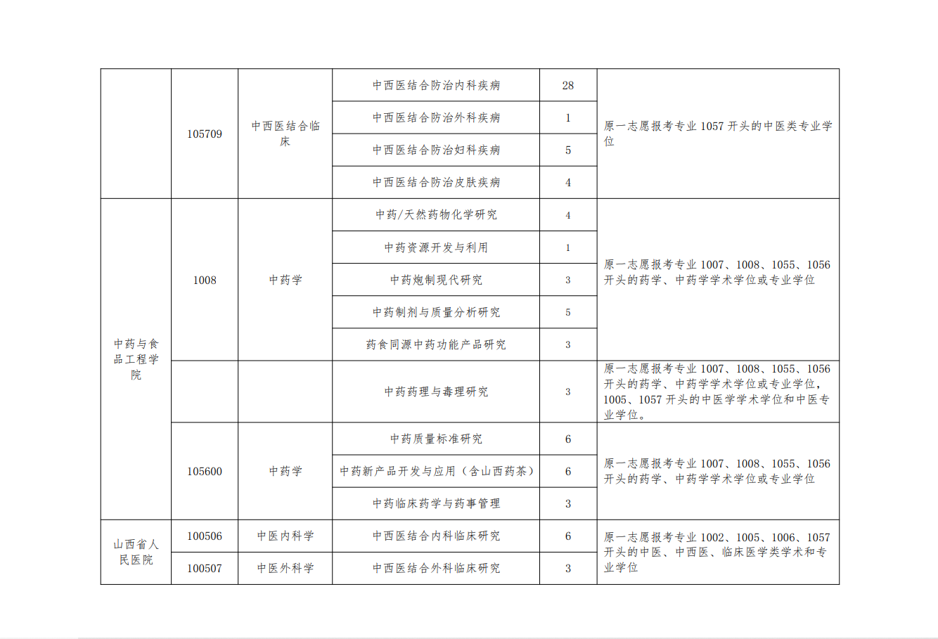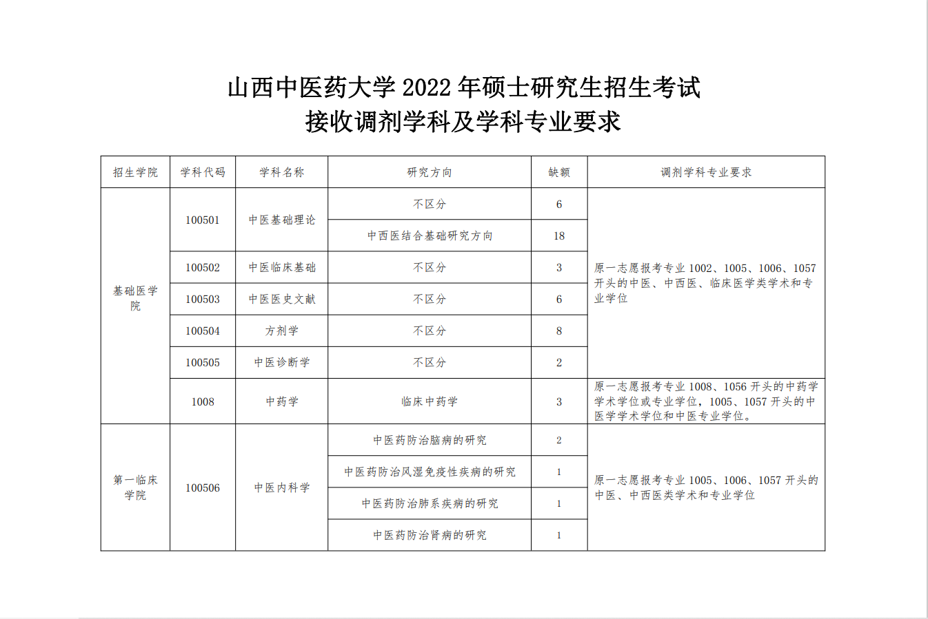 山西中医药大学2022年硕士研究生招生考试接收调剂学科及学科专业要求
