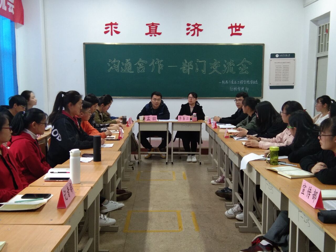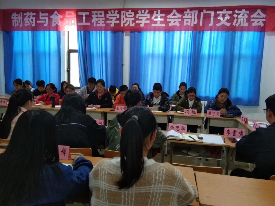 2019年4月12日下午3点50分,制药与食品工程学院于和剂书院甲座205教室举行“沟通合作——部门交流会”。出席本次大会的有:制药与食品工程学院辅导员孟喆老师、李春江老师,第五届学生会主席梁宇同,副主席李思卿、冯烁,以及学生会各部门候选人。本次会议旨在通过各部门的工作汇报了解各个部门,在交流中增进对各部门同事之间的了解,加强团结,凝聚力量,提高办事效率。