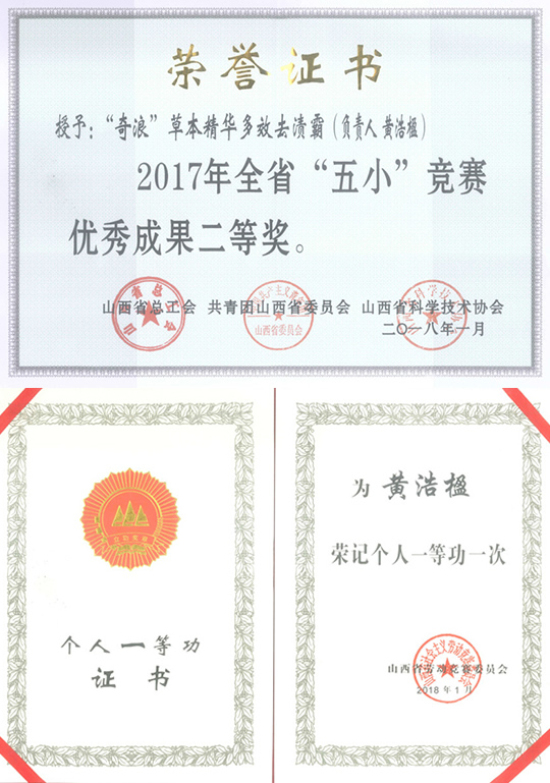 在由省总工会、团省委、省科协联合举办的首届山西省“五小”竞赛活动中,我校中药学院2015级临床中药班黄浩楹同学的“奇浪”草本精华多效去渍霸作品喜获优秀成果二等奖,省劳动竞赛委员会为其荣记个人一等功一次并奖励8000元。