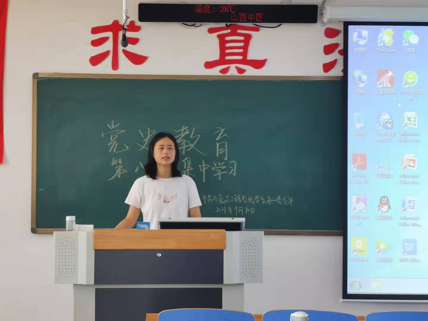 吴梦芬同志首先带领学习习近平总书记在河北承德考察时重要讲话精神,她通过文字图片展示承德历史、现状,从五个方面详细解读考察内容。随后,她联系生活实际带领大家学习了习近平总书记在中央民族工作会议的重要讲话精神,强调到,作为中医药学子和学生党员,要利用好中医药这一中华瑰宝,用实际行动践行塞罕坝精神,筑牢中华民族共同体意识。