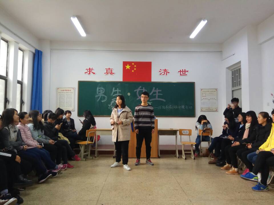 为进一步加强学生的思想道德教育和青春期心理健康教育,引导男女生文明交往,制药工程一班于2016年11月29日在和剂书院甲座305教室举办以“男生·女生”为主题的心理活动。活动由心理委员高婕同学策划并主持。16级制药工程一班全体同学参加活动。