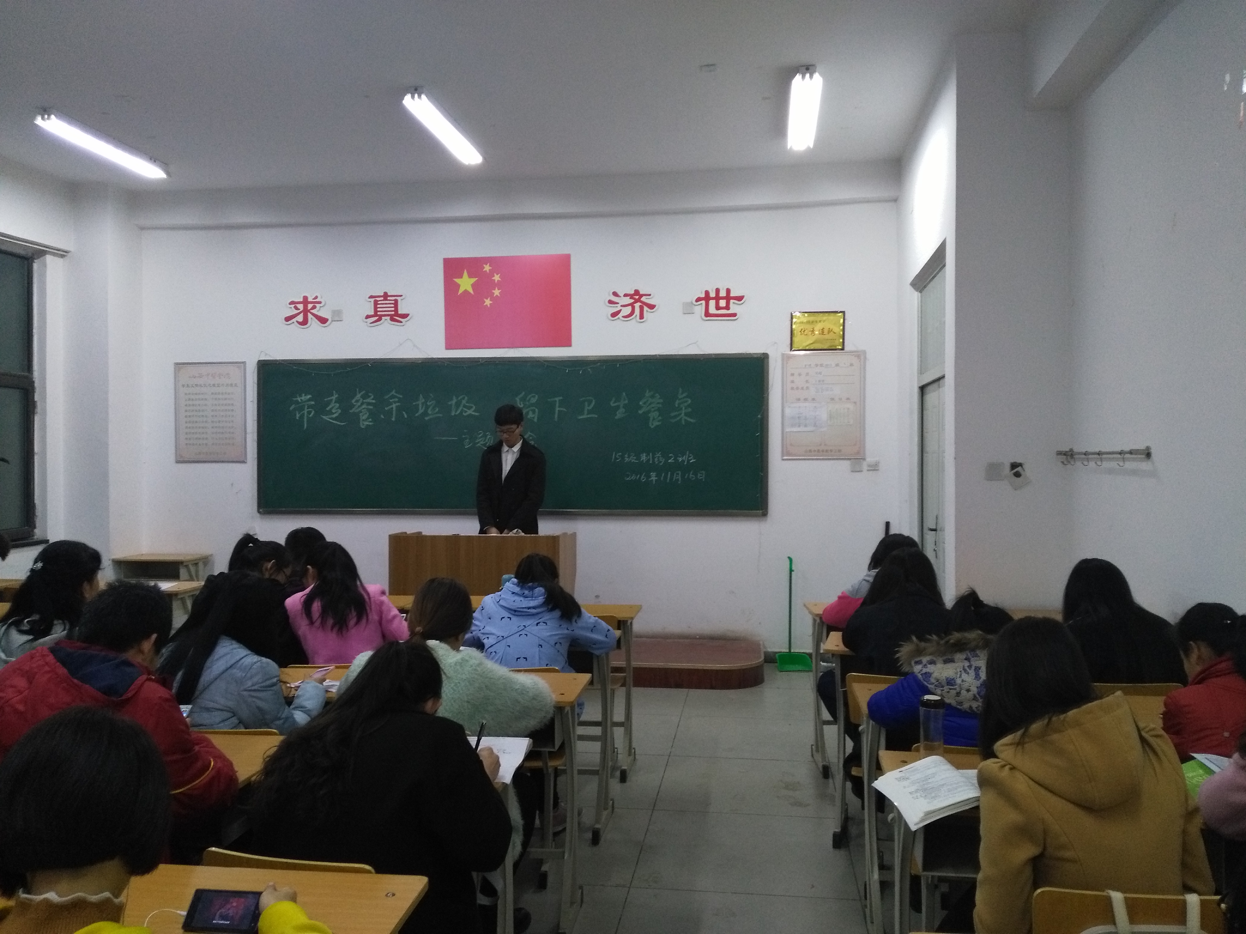 每个人的生活都离不开一日三餐。提倡文明就餐,是当代学生文明修身的一项重要内容。我们要保持食堂良好的就餐秩序,节约用水,节约粮食,文明就餐,从小事做起,从自身做起,力争以自己为榜样,并以自己的良好形象感召身边的人注意文明就餐,使文明就餐成为我们的自觉行动。为了全面提升我校学生的文明素质,强化学生的文明意识;为了给广大同学营造一个良好的就餐环境,培养文明就餐习惯。我班全体成员于2016年11月16日晚7点半在仁爱书院406教室开展此次主题班会。