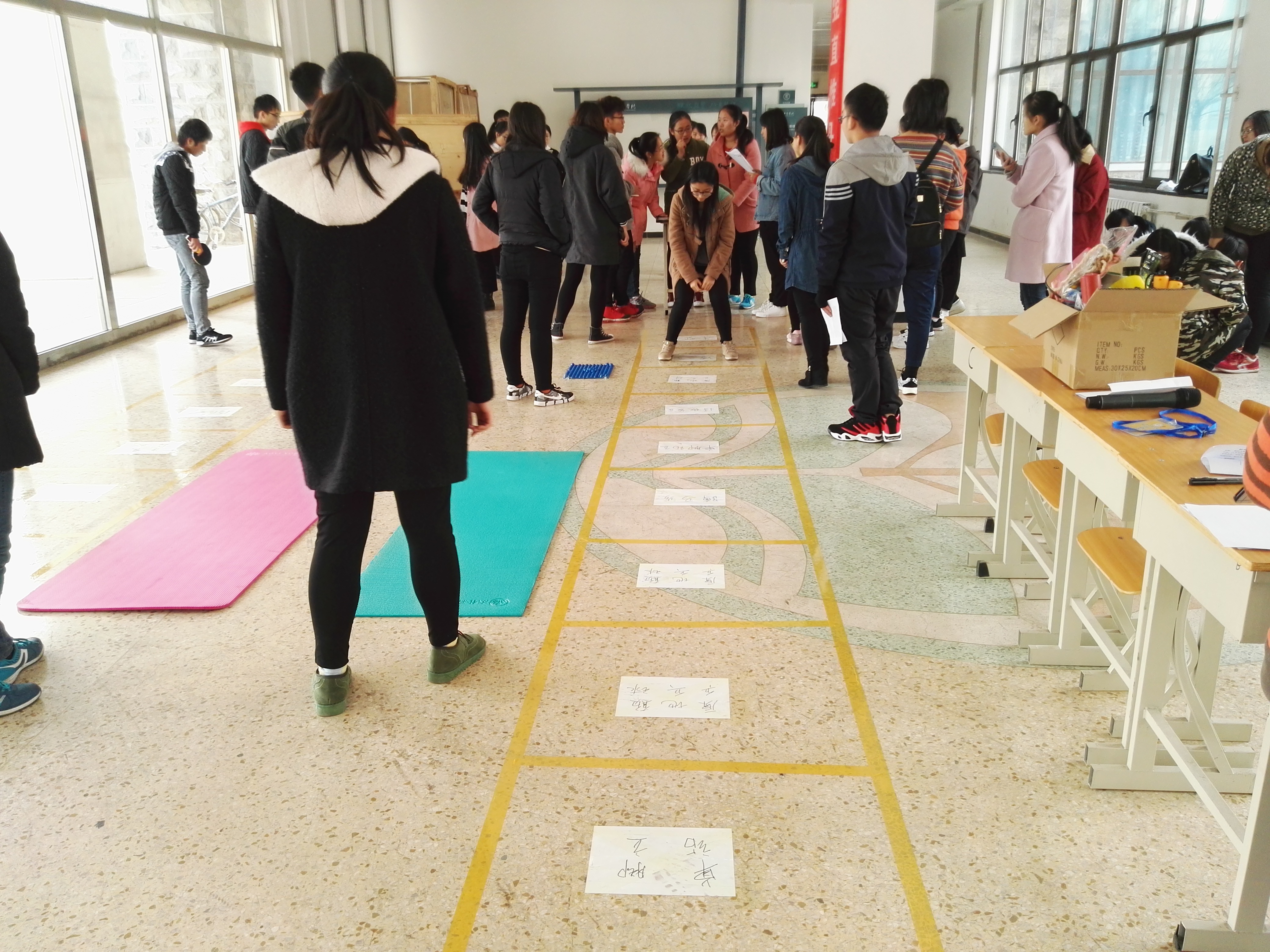 本次大赛分为两场,每次比赛两组同时进行,三人负责答题,一人负责走格,若遇到不能正确作答的题,可选择趣味运动(跳趾压板或平板支撑),共有三次选择趣味运动的机会。先走完十格者获胜。最后根据完成时间长短,共决出四组团队。比赛初始,参赛双方个个剑拔弩张,一副随时战斗的状态。团队成员配合密切,一人走格,三人答题,齐心协力,共解难题。在候场区的同学更是珍惜每一秒,上阵之前再复习一遍题库。比赛如火如荼地的进行着,很快上半场比赛结束。10点下半场比赛开始。答题成员遇到难题时,果断选择趣味运动,或趾压板,或平板支撑,各个成员踊跃参与,为团队加分。