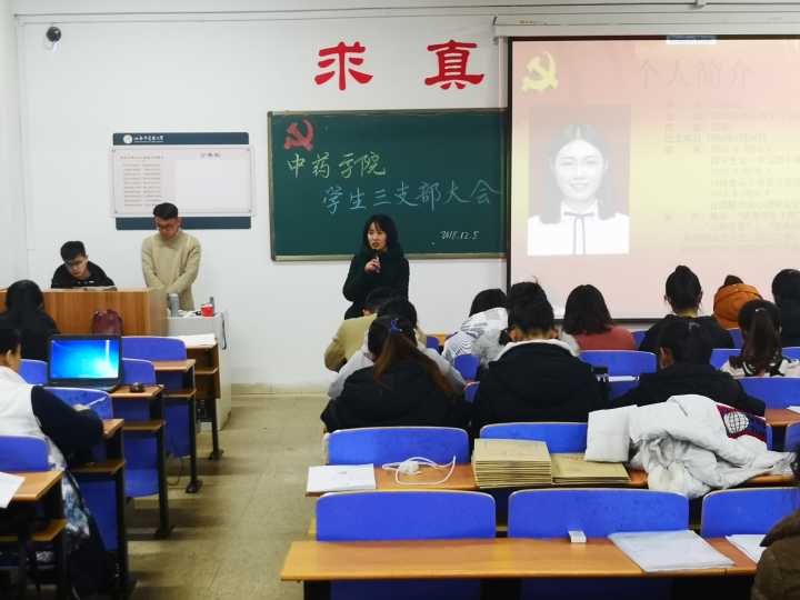 我院于2018年12月5日晚6点在和剂书院甲座210教室召开中药学院学生三支部大会。出席本次大会的有制药与食品工程学院学管办主任毛文英老师、中药学院学生三支部学生党员以及预备党员。此次大会旨在对预备党员发展为正式党员进行表决。